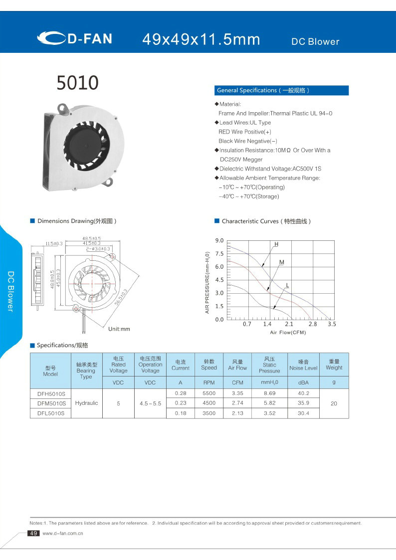 EPC风扇DBH5010S噪音与摩擦力、空气流动有关。风扇转速越高、风量越大,造成的噪音也会越大,另外EPC风扇自身的震动也是不可忽视的因素。当然EPC风扇的自身震动会很小,但前面两个者却是难以克服的。要解决这个问题,我们可以尝试使用尺寸较大的风扇。应在在风量相同的情况下,大EPC风扇在较低转速时的工作噪声要小于小风扇在高转速时的工作噪声。另外一个我们容易忽略的因素是风扇的轴承。由于风扇高速转动时转轴和轴承之间要摩擦碰撞,所以也是上海AK体育·(中国)官方网站噪声的一个主要来源. EPC风扇DBH5010S图示 EPC风扇DBH5010S参数